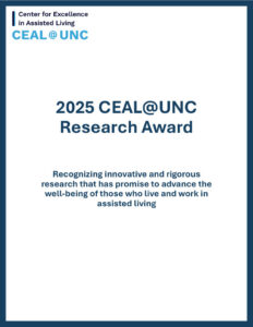 CEAL@UNC Resources 2025 CEAL@UNC Research Award Summary Date: April 2026Topics: Cognitive/Dementia, End of Life, Families/Caregivers, Medicare/Medicaid, Medication, Mental Health, Quality Improvement, Regulation/Monitoring, Staff/StaffingType: PublicationSource: CEAL@UNC CEAL@UNC Guest Columns: McKnight’s Senior Living Date: January 2026Topics: Families/Caregivers, Quality Improvement, Regulation/Monitoring, Staff/StaffingType: PublicationSource: CEAL@UNCDr. Sheryl Zimmerman, Executive Director of CEAL@UNC, is a guest columnist for McKnight’s Senior Living. These regularly published articles reflect the perspectives of CEAL@UNC advisors, and address timely topics relevant to the well-being of the people who live and work in assisted living. View Articles Shared Risk in Assisted Living: Awakening a Sleeping Giant Date: August 2025Topics: Quality ImprovementType: PublicationSource: CEAL@UNC Advancing Excellence in Assisted Living: The Evolution of CEAL@UNC Date: March 2025Topics: Quality ImprovementType: PublicationSource: CEAL@UNC CMS HCBS State Transition Plans Date: September 2024Topics: Medicare/MedicaidType: ReportsSource: CEAL@UNCThis interactive map provides a high-level summary of Statewide Transition Plans (STP) with Final Approval from the Centers for Medicare & Medicaid Services (CMS). The map is updated as CMS updates the states’ approval status. Be Well in AL Recommendations: Resident/Family Checklist Date: June 2024Topics: Cognitive/Dementia, Families/Caregivers, Medical Care, Medication, Mental Health, Quality Improvement, Staff/StaffingType: ToolkitsSource: CEAL@UNCCEAL@UNC recognizes the benefit of ongoing quality improvement in assisted living, including through the implementation of consensus medical and mental health care recommendations disseminated through the Be Well in AL Initiative. This checklist, to be used by residents and their families considering or residing in assisted living, is a helpful tool to understand recommended care […] Potential Actions to Advance Well-being in Assisted Living Date: April 2024Topics: Families/Caregivers, Medicare/Medicaid, Quality Improvement, Regulation/Monitoring, Staff/StaffingType: ToolkitsSource: CEAL@UNCCEAL@UNC recognizes the benefit of ongoing quality improvement in assisted living. Numerous feasible solutions have been suggested that may improve care and outcomes in assisted living, including those in this information sheet. Feel free to utilize and distribute this information sheet among your networks to advance the well-being of the people who live and work […] COVID-19 in Assisted Living: Protecting a Critical Long-Term Care Resource Date: February 2023Topics: COVID-19Type: ReportsSource: CEAL@UNC CEAL 15th Anniversary ALW Workgroup Report Date: November 2019Type: ReportsSource: CEAL@UNC Impacts of Potential Minimum Wage Increases on Assisted Living and Continuing Care Retirement Communities Date: September 2017Topics: Minimum Wage IncreaseType: ReportsSource: CEAL@UNC, RTI International Measures and Instruments for Quality Improvement in Assisted Living Date: March 2016Topics: Quality ImprovementType: ReportsSource: CEAL@UNC The Future of Assisted Living in the Era of Healthcare Reform Date: October 2014Type: ReportsSource: CEAL@UNC Toolkit for Person-Centeredness in Assisted Living Date: September 2014Type: ToolkitsSource: CEAL@UNC, University of North Carolina at Chapel Hill Person-Centered Care in Assisted Living: An Informational Guide Date: June 2010Type: ReportsSource: CEAL@UNC Medicaid-Impact on Long-Term Care Date: February 2009Source: CEAL@UNC A Manual for Community-Based Participatory Research – Using Research to Improve Practice and Inform Policy in Assisted Living Date: January 2009Type: ReportsSource: CEAL@UNC Medication Management in Assisted Living Date: January 2008Type: ReportsSource: CEAL@UNC Making Quality Assisted Living an Affordable Community-Based Care Option Date: January 2005Type: ReportsSource: CEAL@UNC Assisted Living Workgroup (ALW) Report Date: April 2003Type: ReportsSource: CEAL@UNC